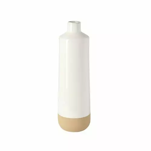 Vase allongé à col finMELEN blanc et terracotta à la base.Ce vase sobre et élégant est parfait pour une décoration éclairée et fera briller vos plus beaux bouquets et compositions florales grâce à son blanc éclatant. Son col resserré permet un excellent maintien des tiges fines, comme celles de lilas par exemple.